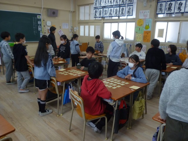 2時限目、教室で百人一首をしました。先生から百人一首のやり方を教えいただきました。