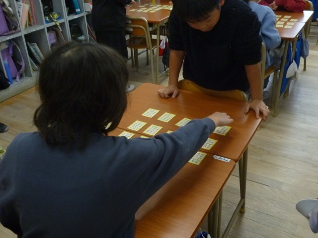 2人向かい合い、読み札に集中し「はい」と言って札を取っていきました。教室中静かで、
