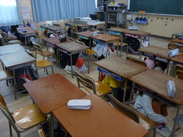 非常ベルが鳴った後地震発生の放送を聞き、すぐに机の下に体を入れました。