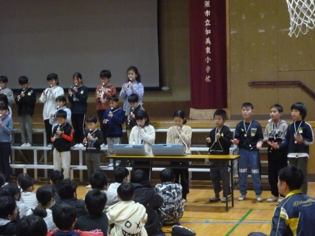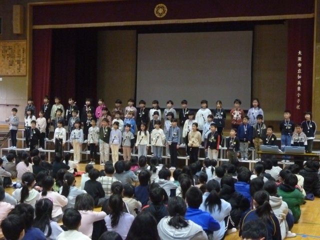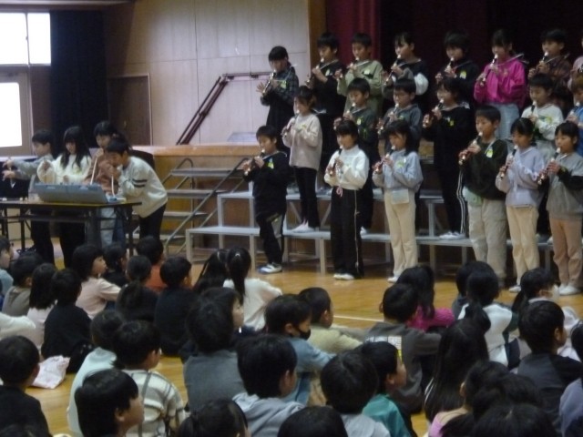 講堂で3年生の学年発表がありました。上手にリコーダーでチャイムの音楽や電車がホームに入る時のメロディなどを吹いていました。最後に、合奏をし、大きな拍手が起こりました。