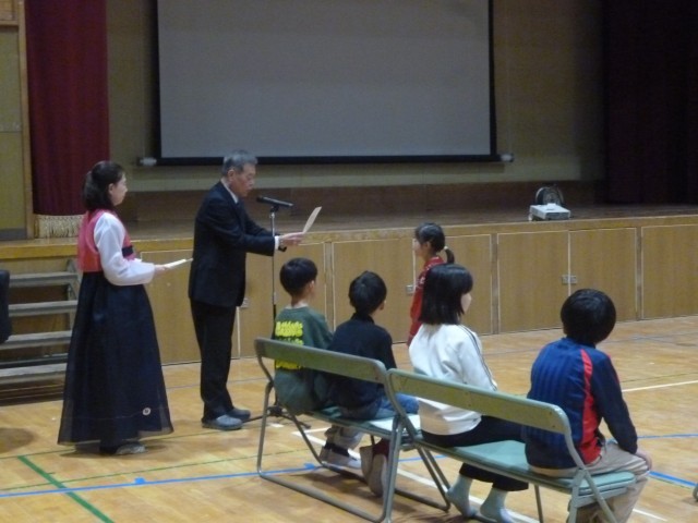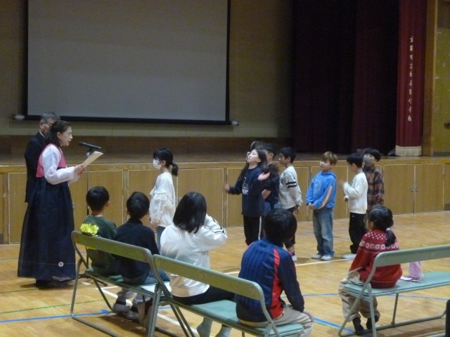 3時30分から講堂で、オリニフェ修了式を行いました。校長先生・ソンセンニムさんから修了証の授与がありました。そして、1年間の活動の振り返りを映像で見ました。学級休業のため、6年生は別の日に修了式を行う予定です。