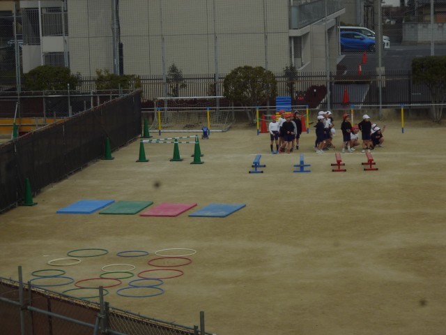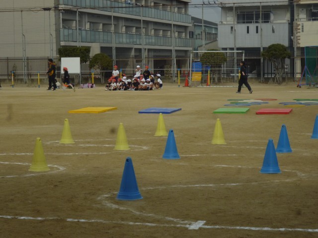 寒い日でしたが、平均台、三角コーン、マットフラフープなどいろいろな器具を回ってリレー競技をしました。大きな拍手と歓声が沸いていました。