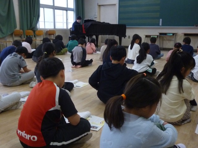 音楽室で「ウンパッパ」「にじのクレヨン」「夕やけ」を合唱しました。息の吸い方・吐き方のアドバイスの後、どんどん上手に声が出るようになりました。