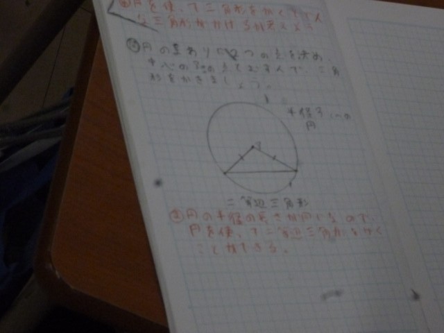 子どもたちは、コンパスやさしを使って三角形を作図しました。円の半径の長さが同じことから「二等辺三角形」だとわかりました。その発展として、「正三角形」もかいていきました。