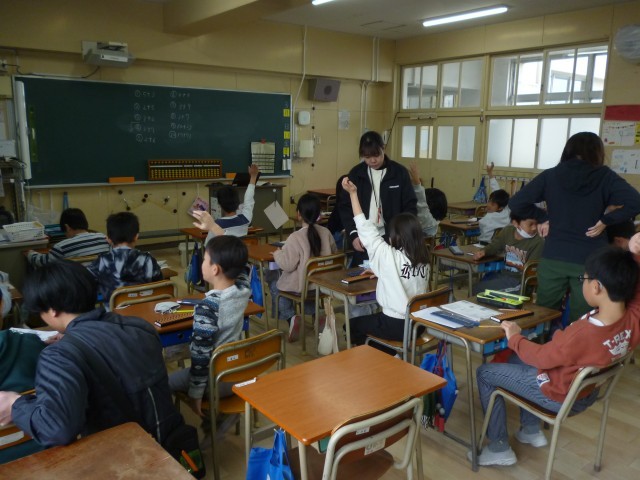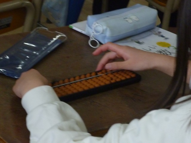 そろばんの使い方を実際に学習しました。3人の先生が巡回して、繰り上がりの時の指のはじき方など、一人一人丁寧に教えていました。