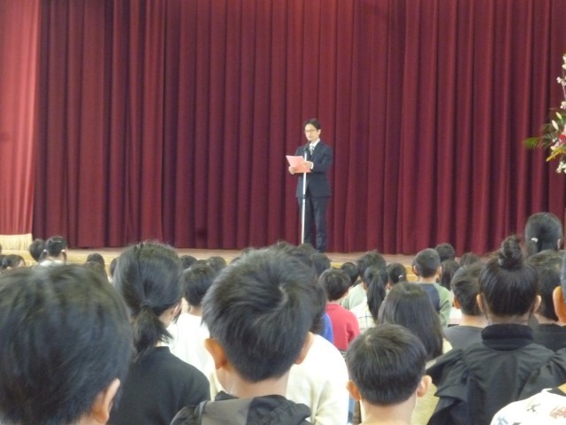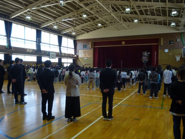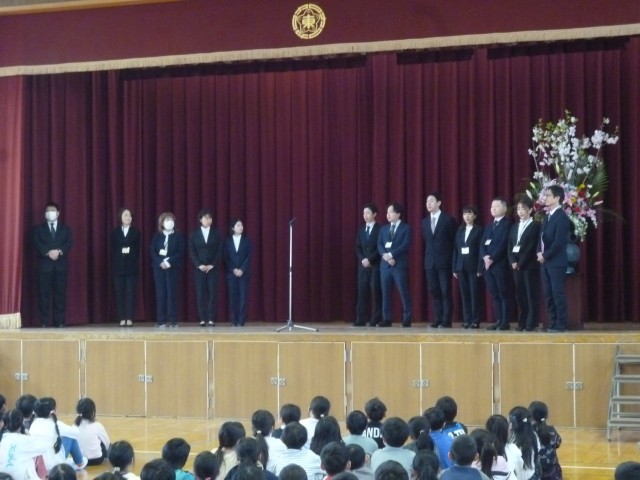 着任式で、新しく来られた12名の先生方の紹介とご挨拶がありました。静かに聞いている態度とよい姿勢だとの感想をいただきました。