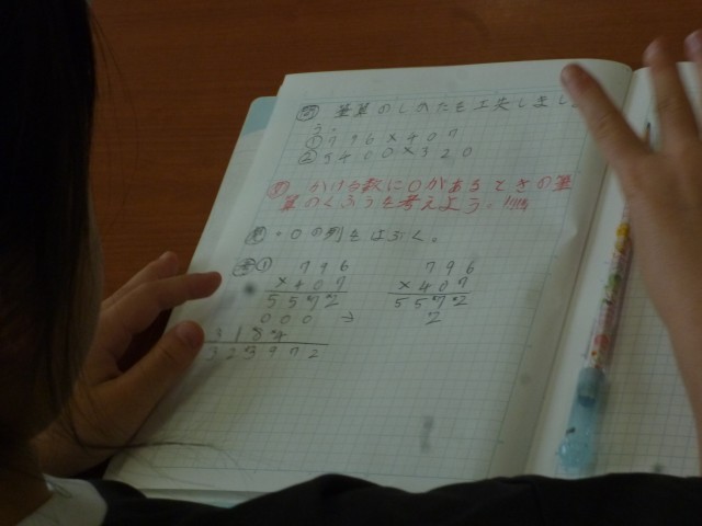 かける数に0がある時の筆算を、めあて・見通しを持ち、近くの人と話合いをし、0の列をはぶくことに気づき計算しました。ノートに書くのが速くなり姿勢もよいと先生からほめられました。