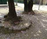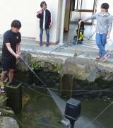 中庭の池を掃除している様子です。 高圧洗浄機を使って勢いよく水を流すと、汚れて...