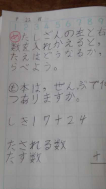 足し算のひっさんの学習です。たされる数、たす数のことばを覚えました。