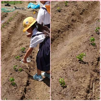 植えた種からは、芽が出てきて二葉になりました。4枚目の葉が出てきているものもありました。余分な雑草を取り除き、成長しやすいように手入れしました。
