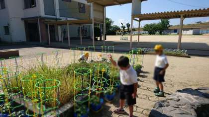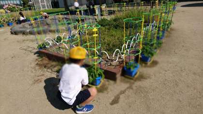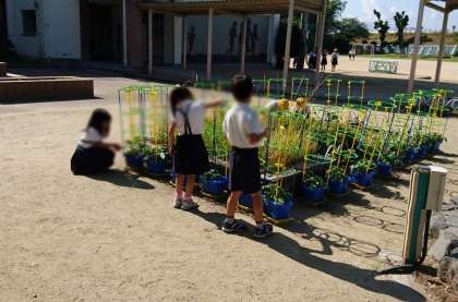 育てている朝顔に、朝の用意ができた人から、朝顔に水をあげています。