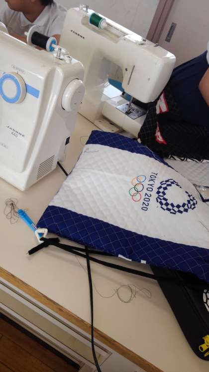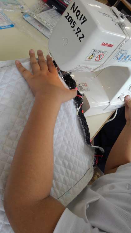 ナップサックの製作をしています。ミシンを上手に使っています。