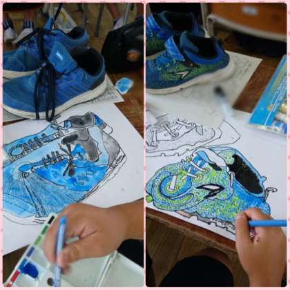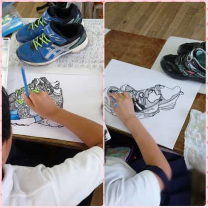 靴を見て、描いています。大きさや靴のかたちをじっくりと見て描きました。絵の具での色付けは、汚れも意識して、少しずつ点を描くようにして、描いています。