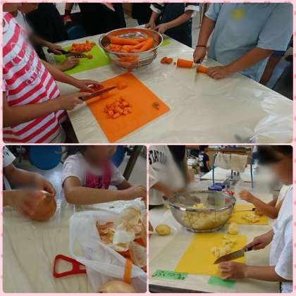 たくさんの保護者の皆さんに助けていただきながら、テントをたてたり、カレーの材料を切ったりしました。