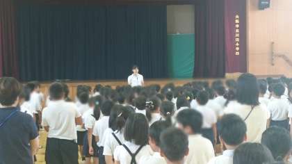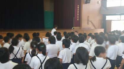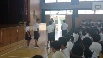 校長先生から、2学期にがんばることの話や、夏休み中の活躍、空手の全国大会で準優勝した人への表彰、水泳記録会に参加した人へ記録証を校長先生より手渡されました。