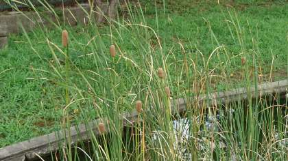秋に向かって、池のガマの穂が少しずつ大きくなってきました。
