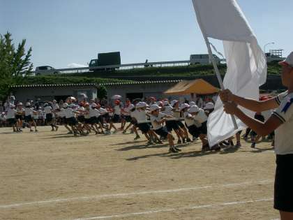 赤がんばれ、白がんばれ見ている子どもたちも