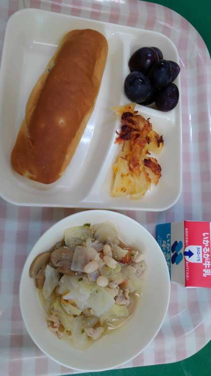 鶏肉とてぼ豆のスープ、じゃがいもとトマトのチーズ焼き、ブドウです。