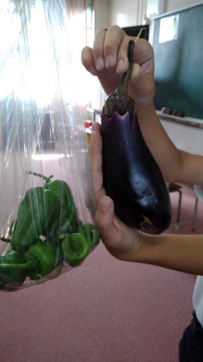 なかよしの学習園でなすびやピーマンがたくさんできています。なすびは、とても大きいです。