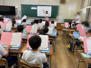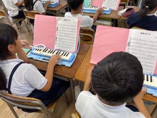 楽譜を見て、先生と一緒にリズムや音階を確認しながら、鍵盤ハーモニカを弾いています。