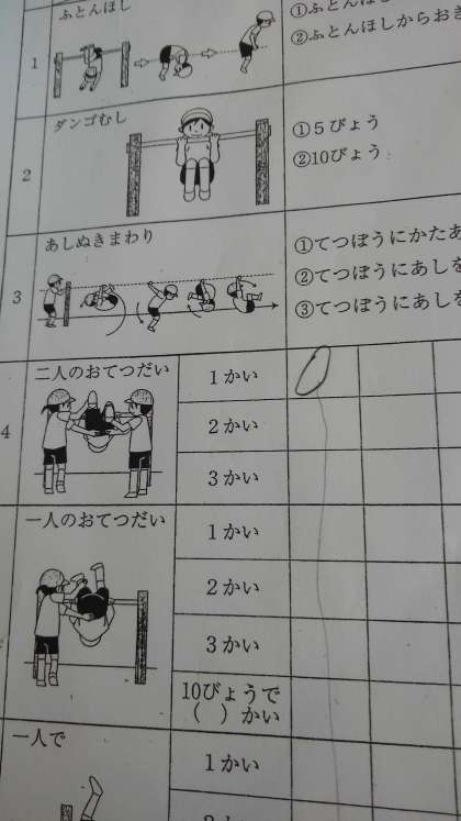 てつぼうカードを見て、てつぼうの練習をしています。