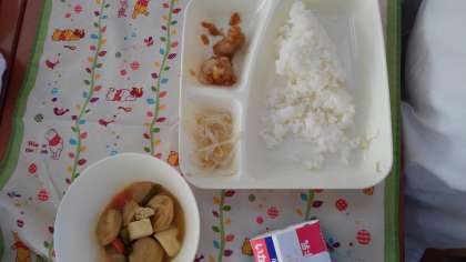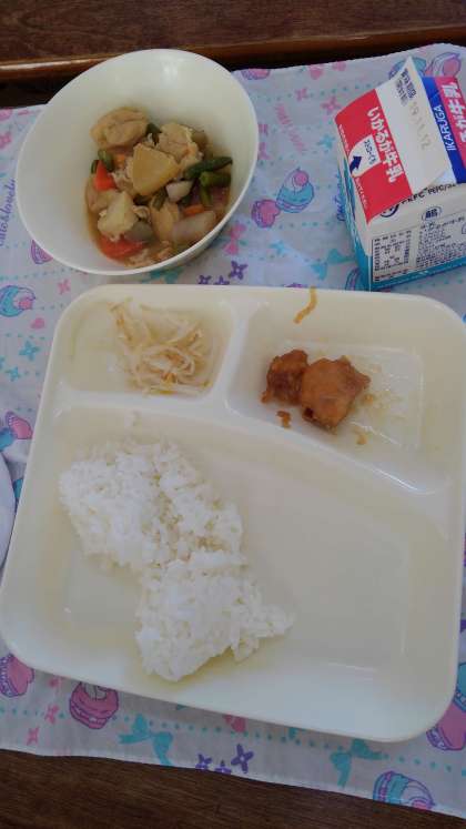 あげどりのねぎだらかけ、含め煮、もやしのゆずの香あえです。