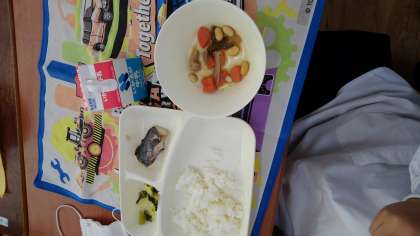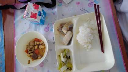 さごしのおろしじょうゆかけ、五目豆、こまつなと白菜の甘酢あえです。