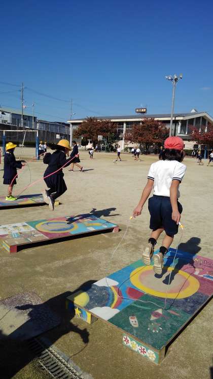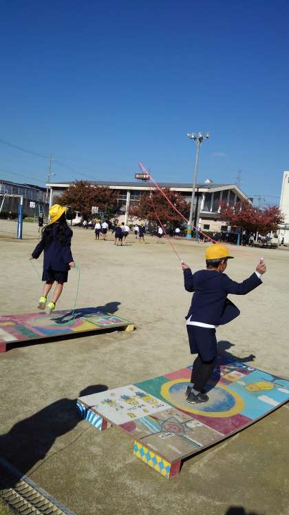 ジャンピングボードでなわとびの練習をしています。