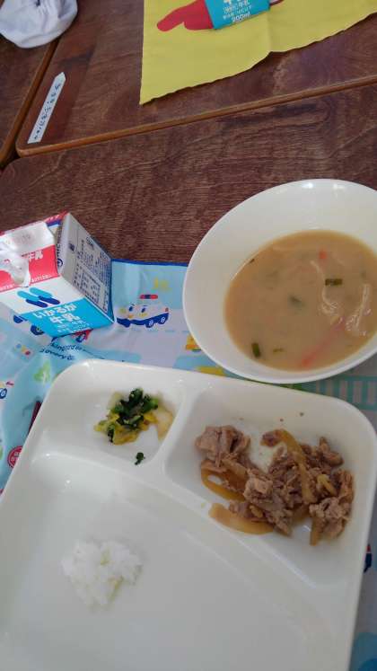 豚肉のしょうが焼き、さつまいものみそしる、きくなと白菜のごまあえです。