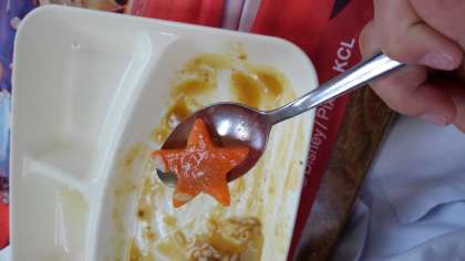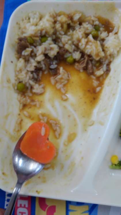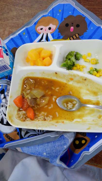 冬野菜のカレーライス、ブロッコリーとコーンのサラダ、黄桃缶詰めカットです。