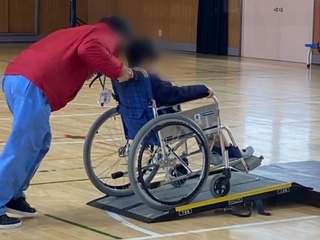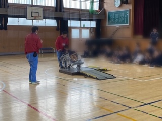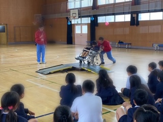 心身障がい者リハビリテーションセンターの方に来ていただき、車車いす利用者への介助の仕方や実際に車いすに乗り操作方法などを学びました。子どもたちは、障害のある人への理解などを深めました。