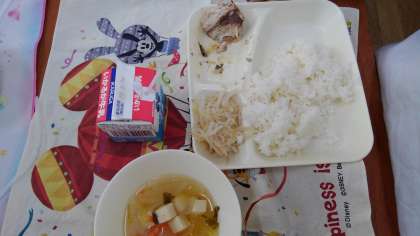 さばのみそ煮、すまし汁、もやしのゆずの香あえです。