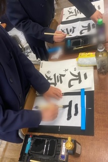 書き初め用の長半紙(条幅八分の一、八つ切り紙)に、文字を書きました。長い紙なので、立って全体を見ながら、書きました。