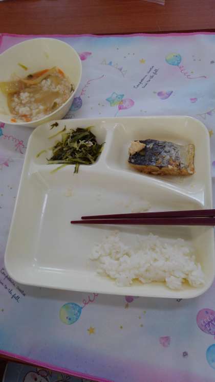 さごしのしょうゆだれかけ、みそしる、みずなの煮びたしです。