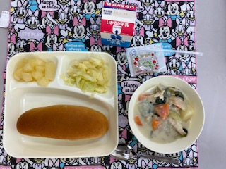 ほうれん草のクリームシチュー、キャベツのサラダ、洋梨(カット缶)、コッペパン、リンゴジャム、牛乳