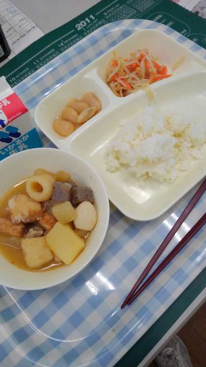 関東煮、もやしとにんじんの甘酢あえ、白花豆の煮物です。