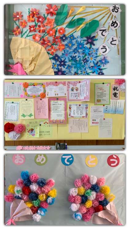 写真は、入学や進級に向けてデコレーションした掲示物を紹介しています。