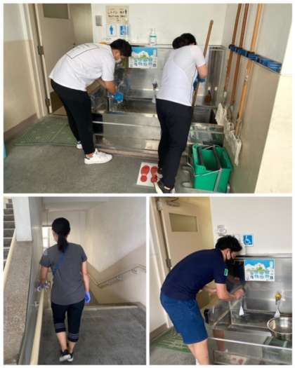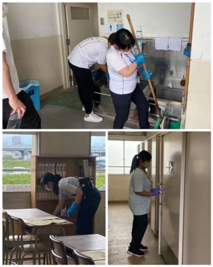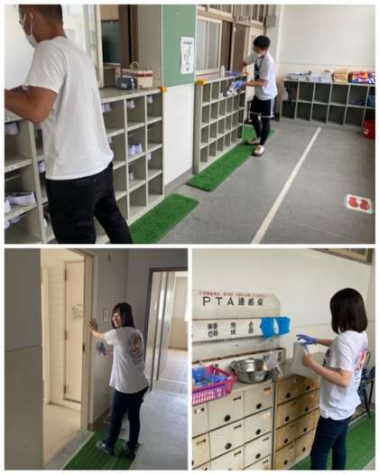 前半の子どもたちが帰った後、後半の子どもたちが帰った後、こまめに教職員で掃除や消毒をしています。
