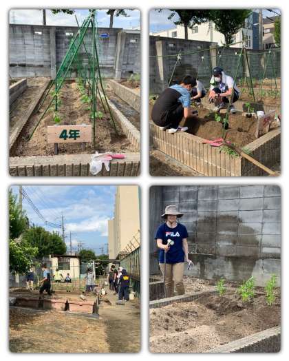 先生たちでプールの裏手にある各学年の学習園に、植物の苗を植えたり、種まきをしたりしました。今日植えたのは、へちま・ひょうたん・ホウセンカ・マリーゴールドです。