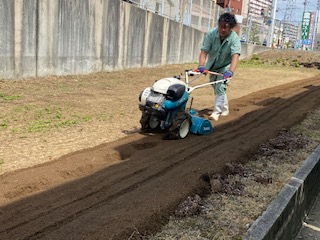 サツマイモや綿を例年植えている部分の土を管理作業員さんが、機械を使ってしっかりと耕してくださいました。