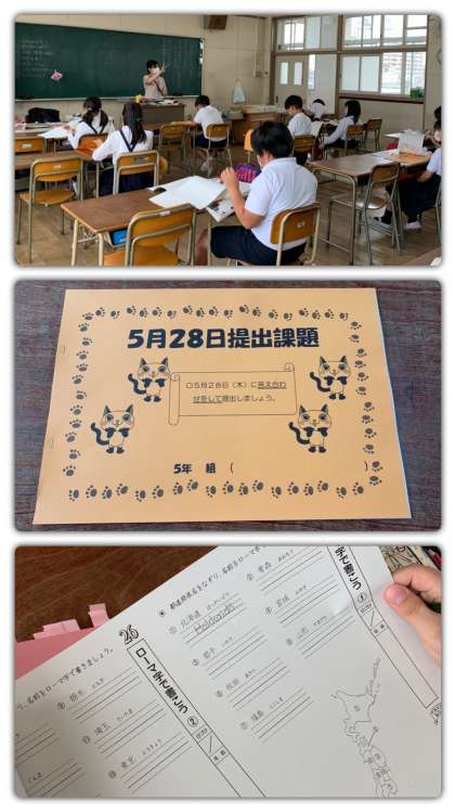 5月最終週の登校日が始まりました。今日は2・5・6年生の児童の皆さんです。6年生だけは、午前3時間、午後3時間に分けて週3回の授業を行っています。