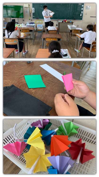 5年生は、与えられた課題をどんどんこなし、復習を兼ねて学習をすすめています。また、今日は折り紙で傘を作りました。