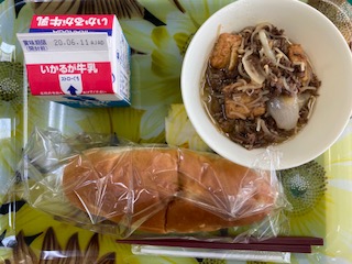 牛乳、おさつパン、すき焼き煮