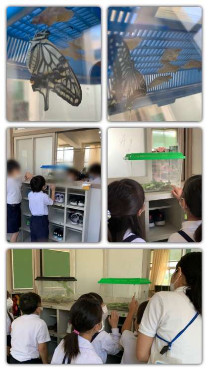 さてさて、今日も蝶々がさなぎから羽化しましたよ。たくさんのお友達が観察に来ました。皆さんが寝ている間に美しい姿に変身しているのですね。明日も明後日も続きます。楽しみですね。
