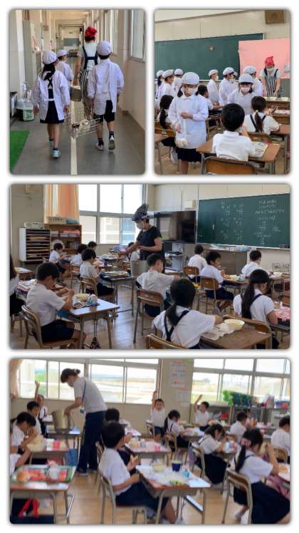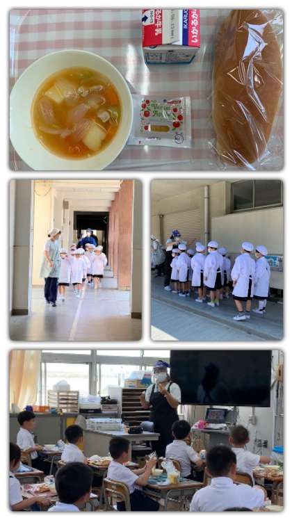 お腹がすいて、みんなが楽しみにしている給食の時間です。6月8日のメニューは、パンと牛乳とジャムとフレッシュトマトのスープ煮でした。お当番の人は、担任の先生と一緒に並んで給食室まで行きます。ジャムや牛乳もみんなに当たるように、配ってくれています。感謝の気持ちで「いただきます」をしました。