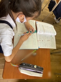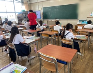 社会科では、大阪府について学習しています。形や東西南北に何があるかなど、調べて見つけています。