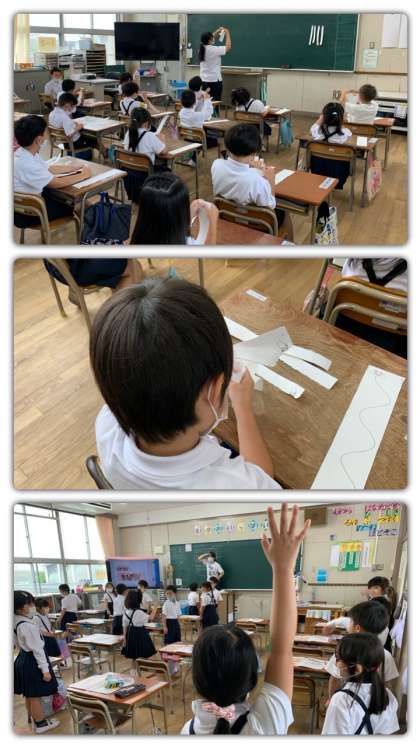 3時間目の1年生です。2組では、紙を手で切る方法を教えてもらって練習しています。はさみがなくても手の先をうまく使って切れました。集中力が大切です。無心になってちぎってましたよ。