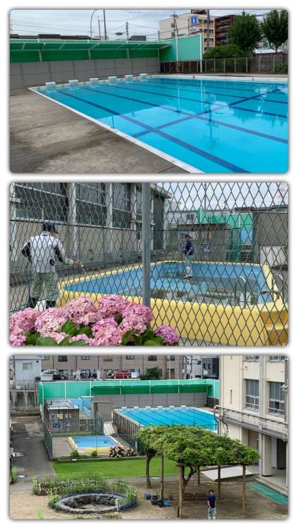 川辺小学校には大小2つのプールがあります。小プールの方は普段、水が恐い人や苦手な人のための水ならしとして、また、地域の幼稚園との交流活動として使用しています。今年は感染症対策のため水泳の授業は行いませんが、来年のために管理作業員さんが小さい方もきれいに清掃してくださいました。