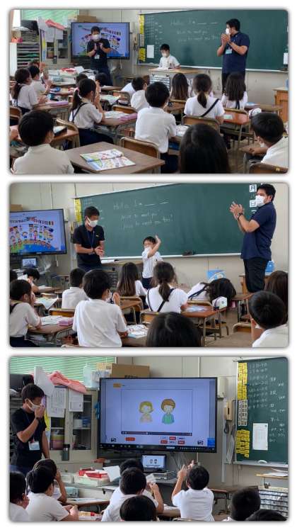 3年生は、C-NETのクリスチャン先生と英語の授業です。今日はあいさつの練習をしました。みんなの前でちょっと恥ずかしそうに、でも一生懸命にクリスチャン先生と対話していましたね。みんなからの拍手をもらうと、とてもうれしいです。