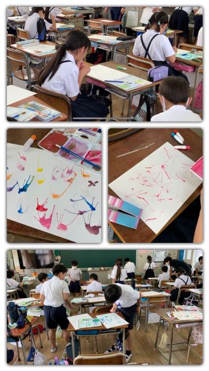 4年生は、図工で「吹き流し」の技法を使って模様を作っていました。ストローで色のついた水滴を吹いて偶然にできる模様がなんとも面白いです。これは第1段階で、いろんな技法を学んだ上で、本格的な作品作りに入っていきますよ。
